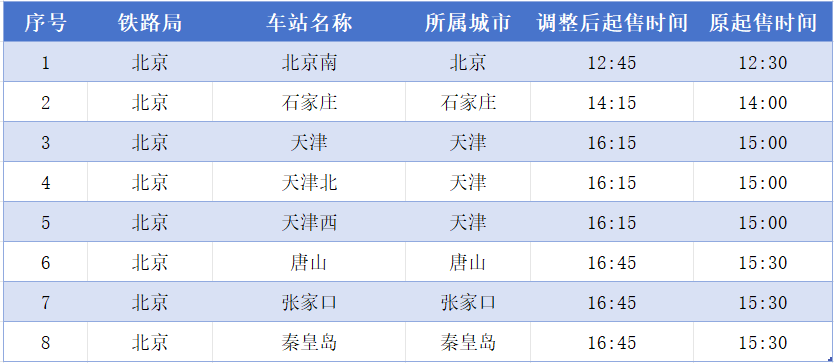 6月7日零时起,铁路部门对南京、南昌、广州南、上海虹桥、石家庄、济南等99个车站的车票起售时间点进行优化调整,起售时间间隔由30分钟调整为15分钟,起售时间点由21个增至41个,车票起售时间点仍为每日8时至18时,上述车站具体车次对应的起售时间点可通过铁路12306网站、客户端和车站公告等渠道查询,请旅客朋友及时关注起售时间点变化情况,以便安排购票事宜。其他车站的车票起售时间点不变。