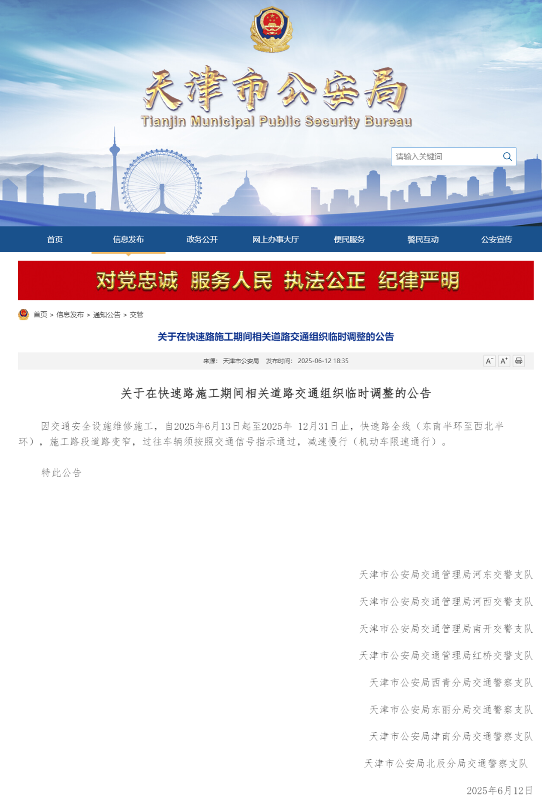 因交通安全设施维修施工,自2025年6月13日起至2025年12月31日止,快速路全线(东南半环至西北半环),施工路段道路变窄,过往车辆须按照交通信号指示通过,减速慢行(机动车限速通行)。