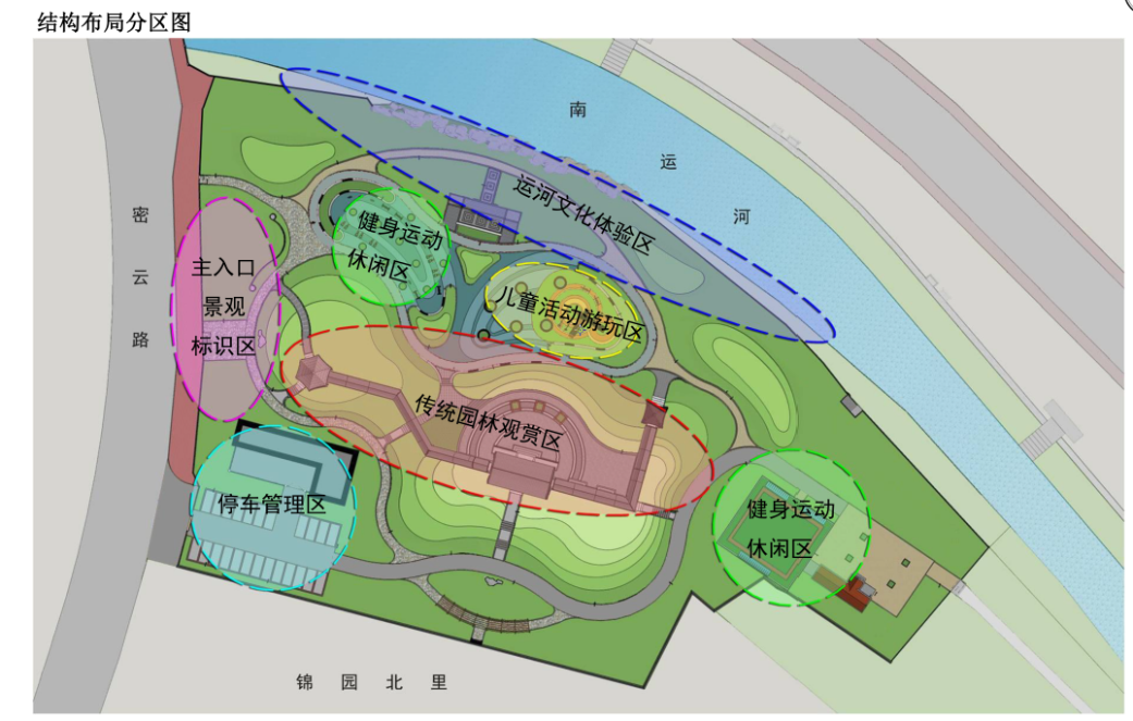 项目计划延续南运河已提升改造区域的风格,结合我市对大运河文化保护传承利用的要求,对该地块进行绿化建设,打造世界杯投注 南运河文化公园。共分为六个主景观功能区,分别为:主入口景观标识区、运河文化体验区、传统园林观赏区、健身运动休闲区、儿童活动游玩区、停车管理区。