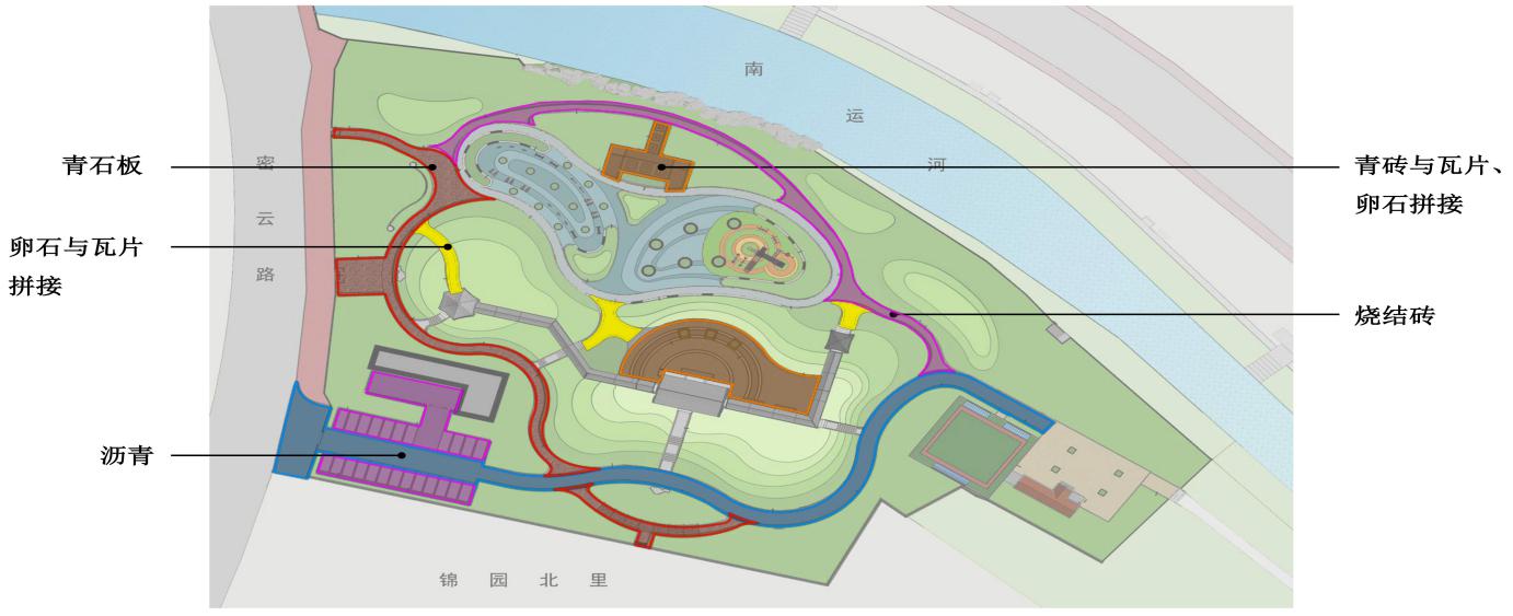 广场:青石板结合、瓦片、卵石及仿古砖结合铺装形式。