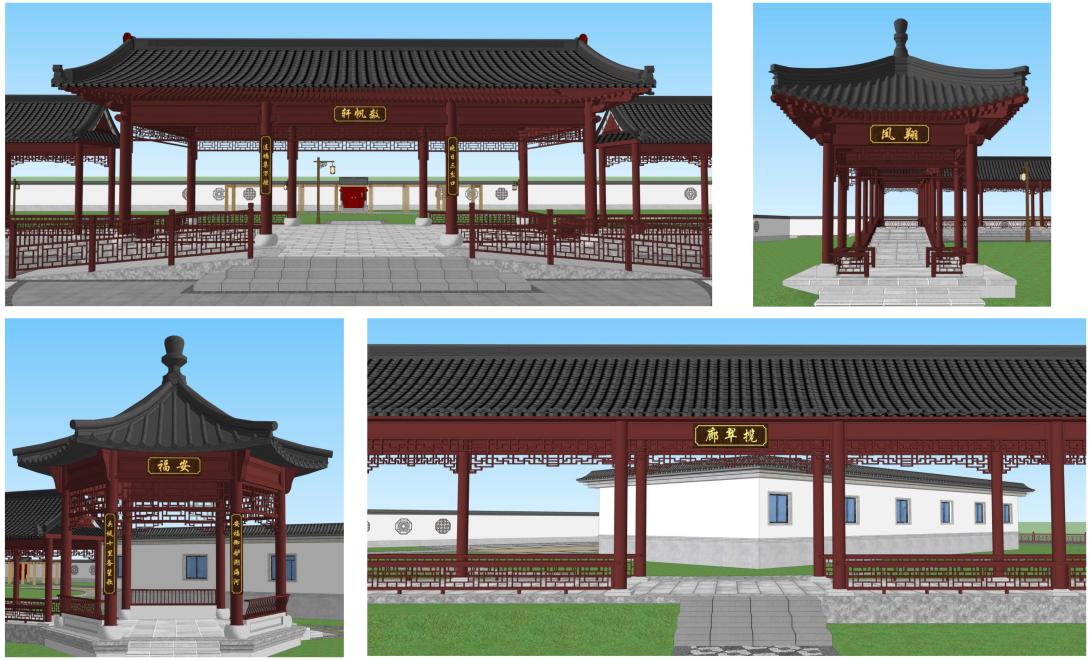 古建亭廊包括连廊、四角亭、六角亭、榭,均为钢筋混凝土结构,木构造屋顶、铺青瓦。
