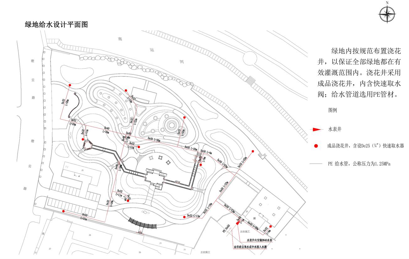 表阀门井,井内设逆止阀及PE D25泄水球阀,接入点及给水管道可根据现场情况做适当调整,要求给水干管水压不小于0.25MPa。
