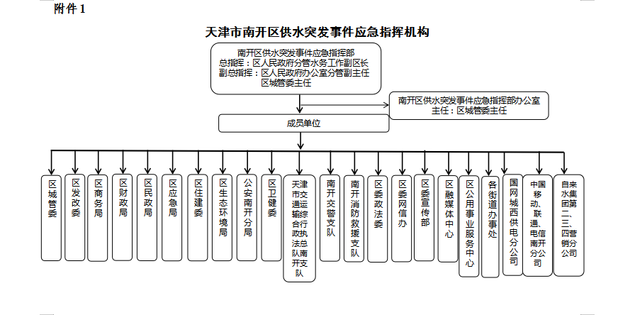 2.3.1 成员单位:区城管委、区应急局、公安南开分局、南开交警支队、区民政局、区委宣传部、南开消防救援支队、区财政局、区卫健委、区融媒体中心、区委网信办、国网天津城西供电公司、区住建委、区公用事业服务中心、区市场监管局、区国动办、区武装部、天津市交通运输综合行政执法总队南开支队、中国联通南开分公司、中国移动分公司、中国电信分公司。