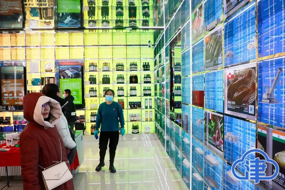 在展示大厅内,来自世界各地、独具港口特色的邮轮、沙滩、红酒、生鲜、水果等产品进行集中展示展销,为广大市民和游客带来文旅+商贸+游购娱的全新体验,市民游客可以在现场采购、扫码预定,由物流配送到家。开业至今40多天,这里已经成为市民游客了解天津港产城融合的打卡目的地。