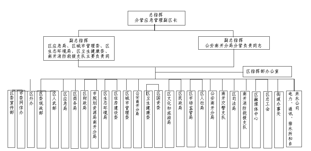 2.1.1设立世界杯投注 危险化学品事故应急指挥部(以下简称区指挥部),统一领导、组织、指挥本区一般危险化学品事故预防与应急处置工作;配合市指挥部,组织区指挥部成员单位开展较大以上危险化学品事故应急处置工作。区指挥部总指挥由区人民政府分管应急管理工作的副区长担任,副总指挥由区政府办分管副主任、区应急局、区城市管理委、区生态环境局、区卫生健康委、南开消防救援支队主要负责同志和公安南开分局分管负责同志担任。