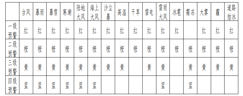 预警级别由高到低分为一级、二级、三级、四级,分别用红色、橙色、黄色和蓝色标示,依次代表可能发生特别重大、重大、较大、一般大面积停电事件。预警级别的划分标准按照市级专项应急预案的规定执行。